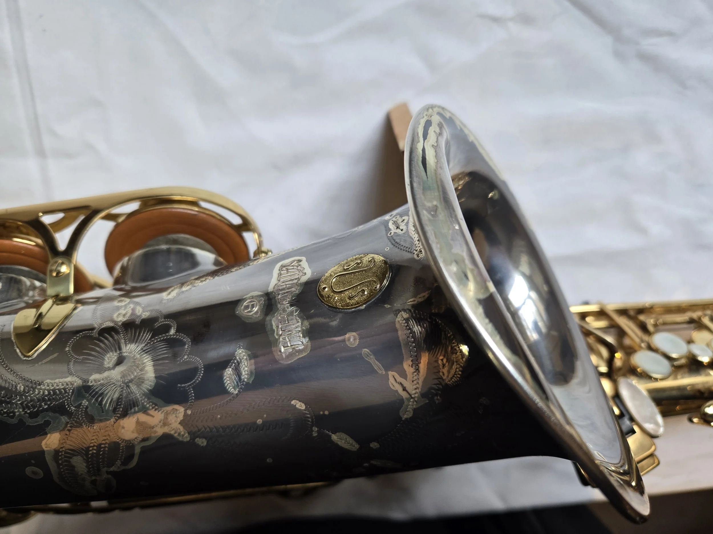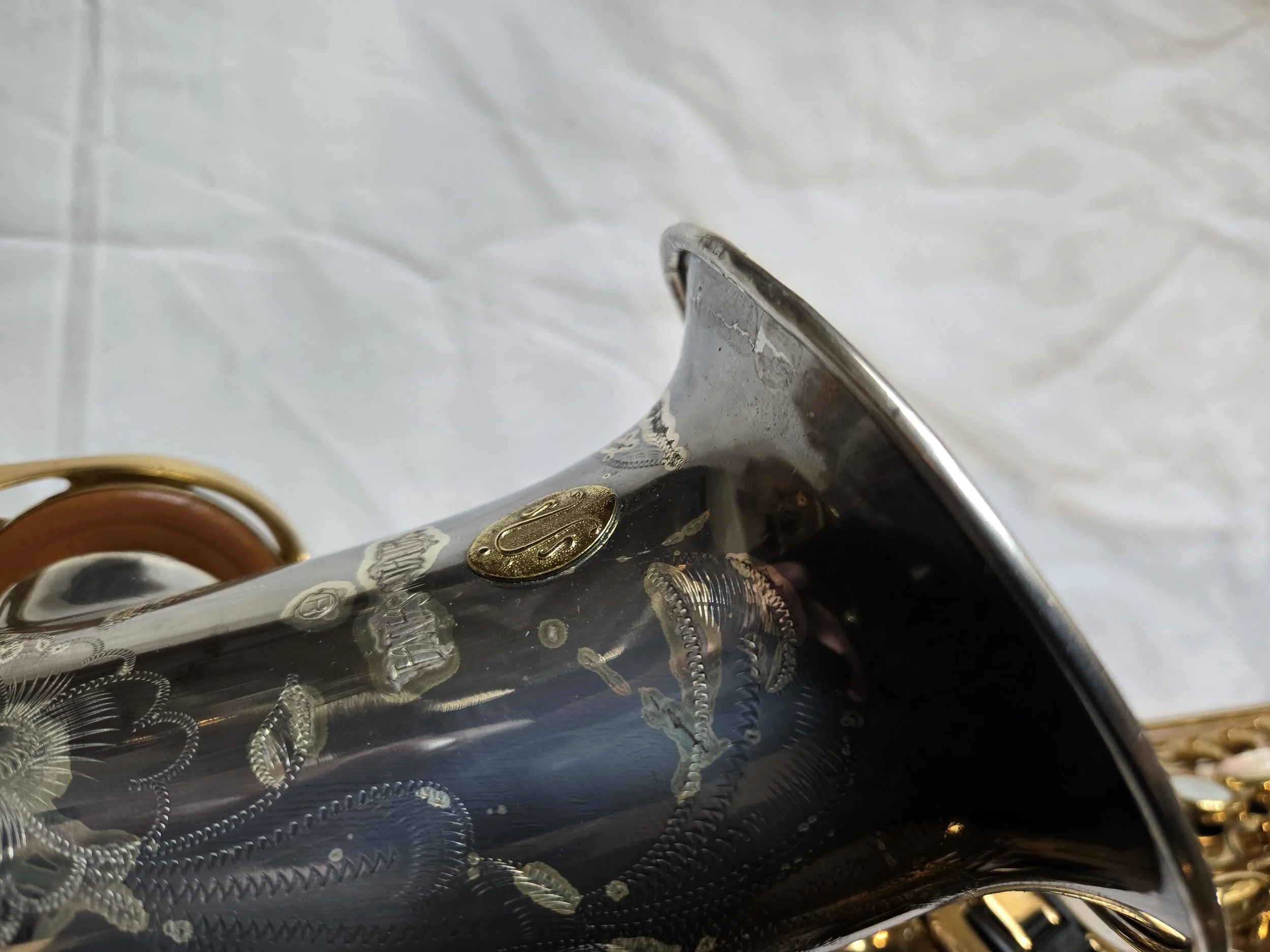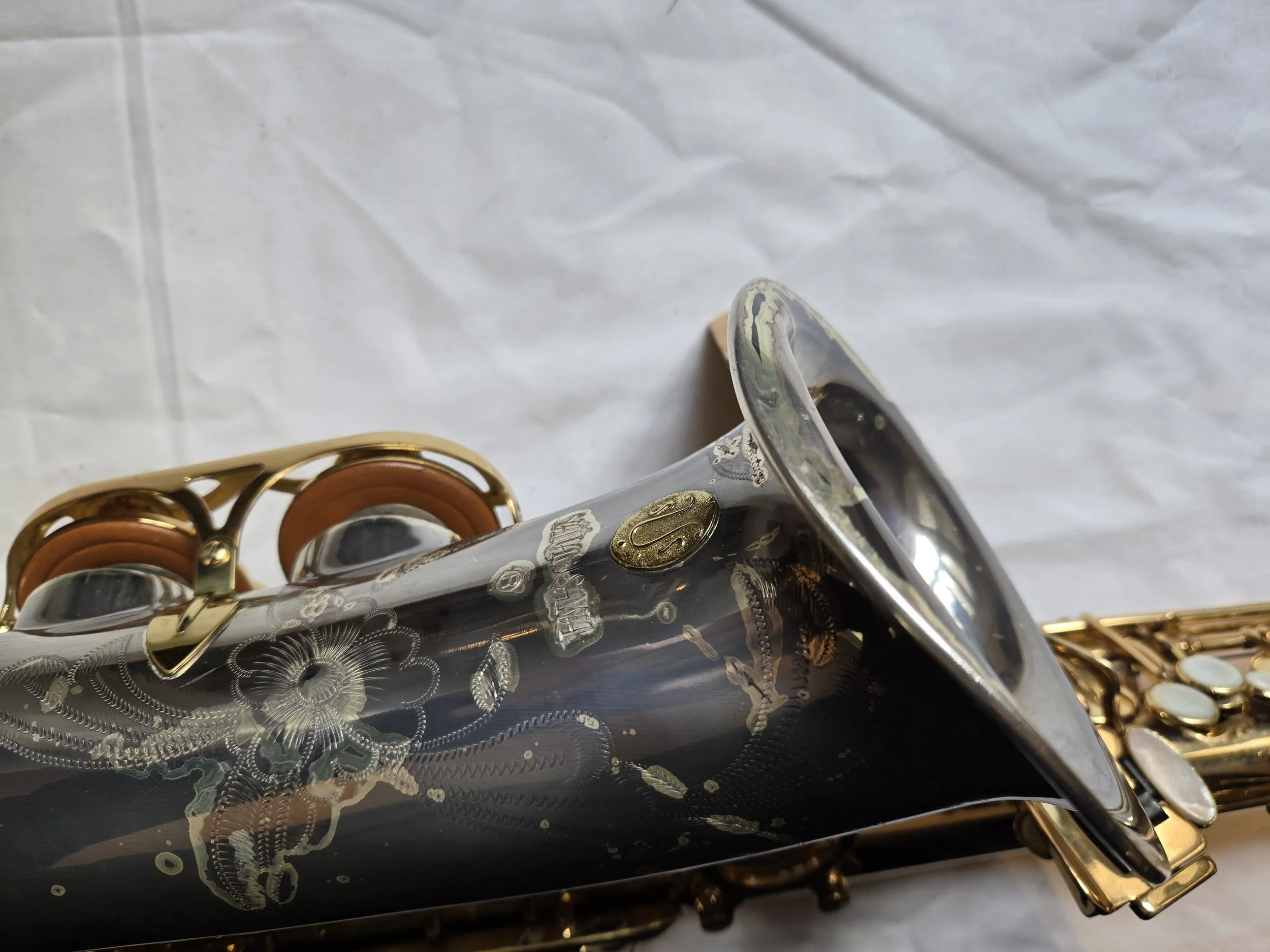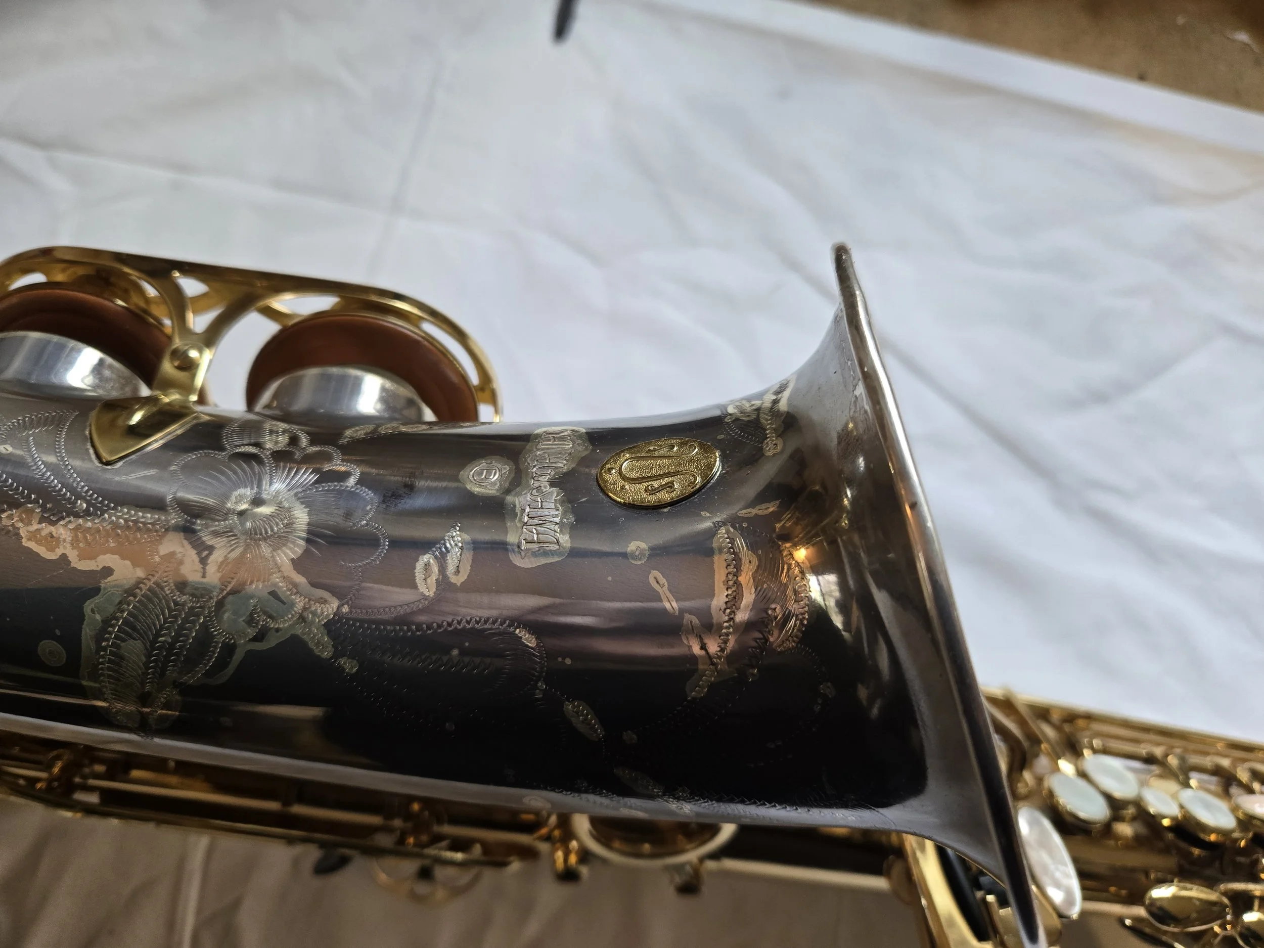 This is a Selmer Reference 54 tenor sax which is a professional model instrument that costs about $7000.00! Not only did the bell rim get bent but the bell was knocked out of alignment. This means that the 3 lowest keys on the horn, low C#, low B & low Bb were unable to cover the tone holes that they are supposed to cover. This means you couldn’t play those notes. So, the repair was more extensive than just a bent bell rim and more involved that what you see at first glance.