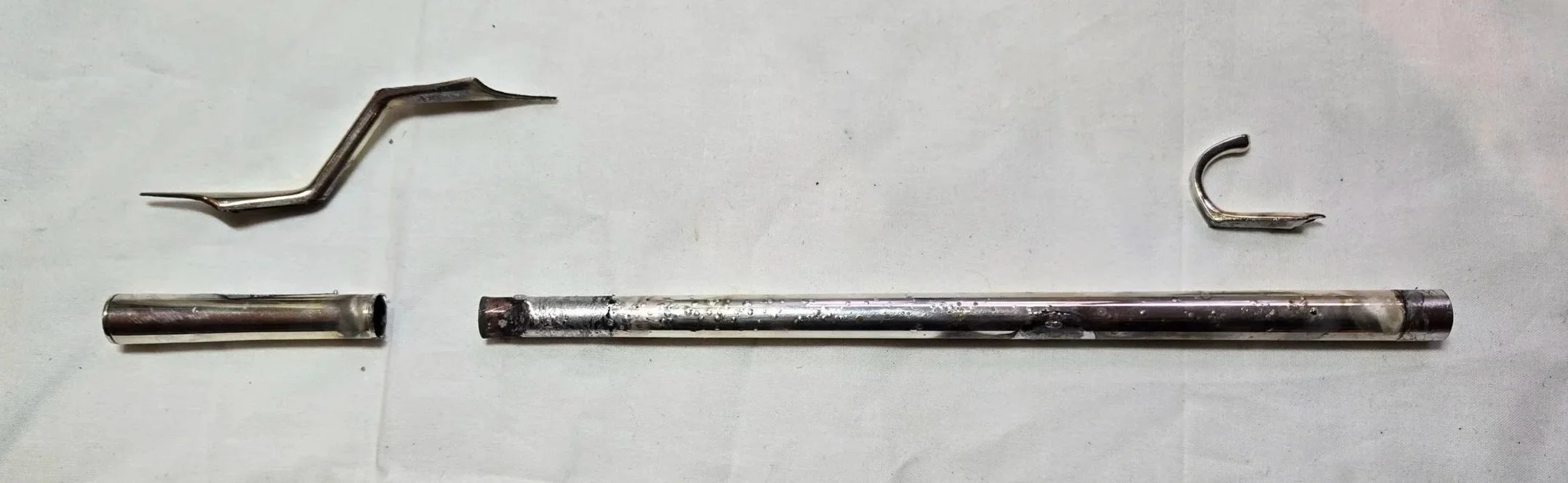 In this photo below I have removed the bad lead pipe plus the mouthpiece receiver, one brace and the finger hook.