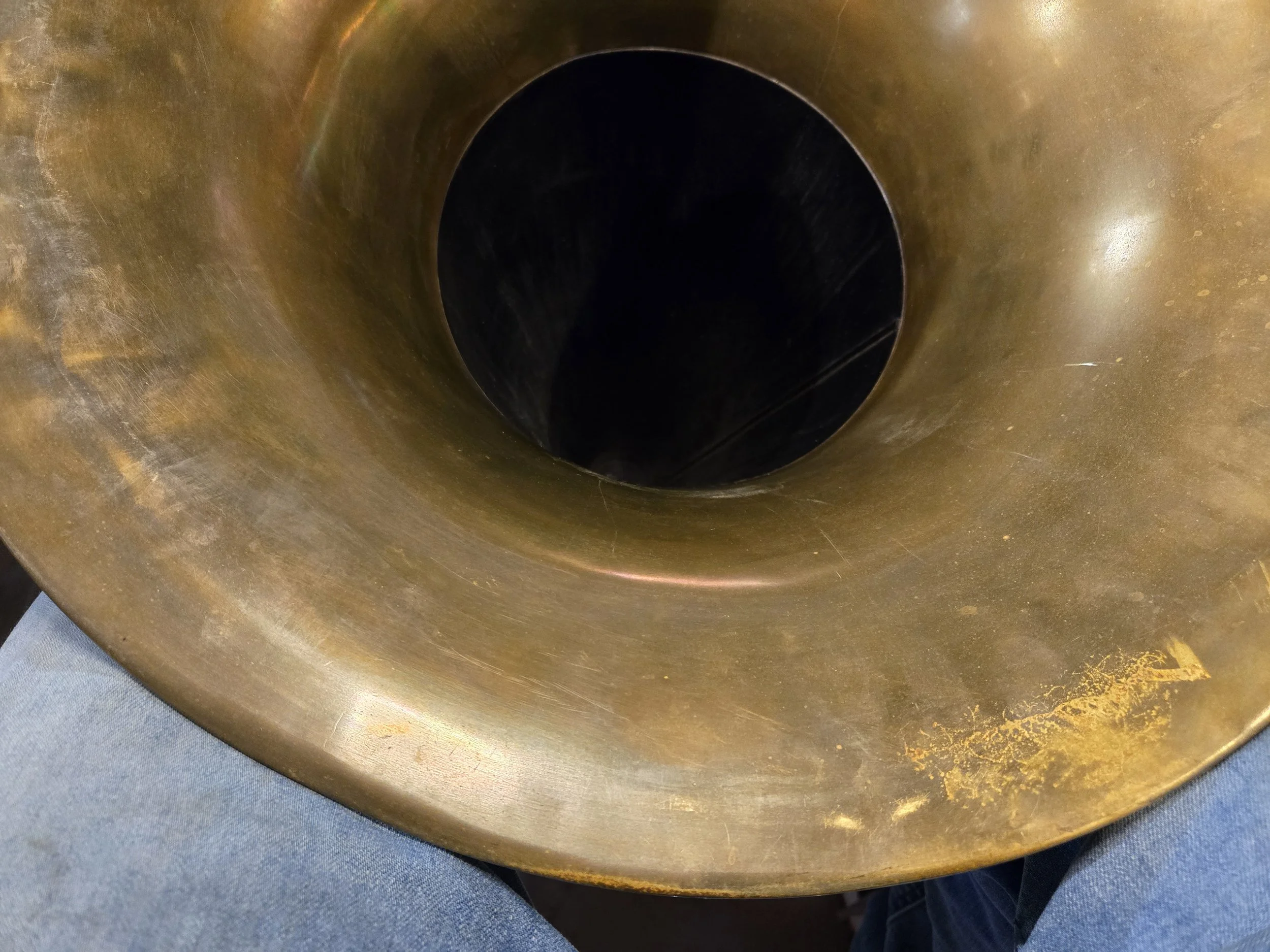 On my front porch I happen to have a unique instrument that serves multiple purposes. This is an Eb tuba which is not commonly seen unless you are in an orchestra that has a specific part written for an Eb tuba or in an ensemble like a funky brass band. Or maybe you’re busking on a sidewalk somewhere. Most tubas you see are called Bb tubas or BBb tubas (double B flat Tubas). This particular Eb tuba has long since past its prime so, I mounted it on a piece of soapstone and Vanessa uses it for a planter or something interesting during the holidays. For example, at Christmas Vanessa puts decorations in it. Recently, the 2 brass rods on either side of the tuba, that I installed, rusted through and the tuba fell off the soapstone base. So, this morning I hauled the creature into my shop and repaired. I mean, it’s what I do! Now it will live again as a planter, holder of Christmas decorations or who knows what.
