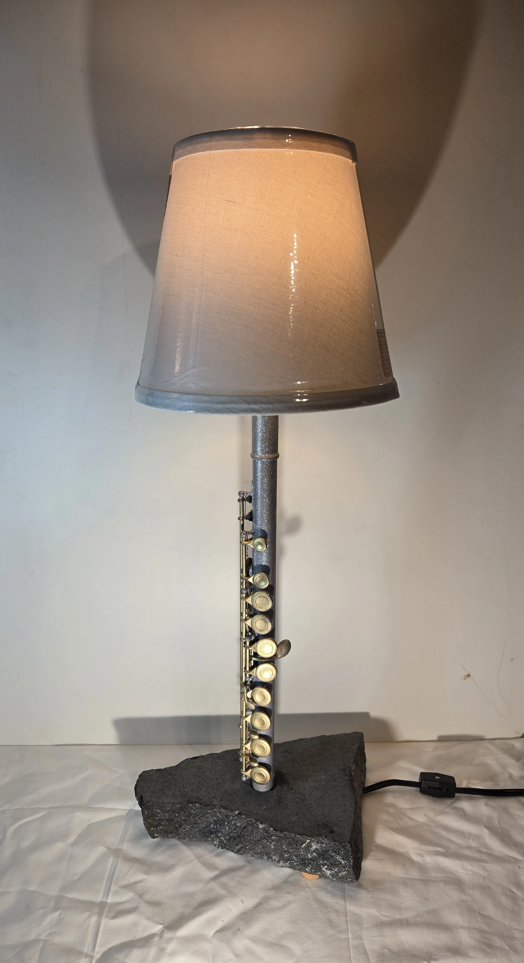 So, I mounted the flute onto a piece of soapstone. Plus, I had to drill a hole in the soapstone and secure a threaded brass tube to it to hold the flute securely. Next, I ran an electric cable, with a switch on it, through the brass tube and connected it to a light bulb socket at the top of the flute. The light socket is also screwed to the top end of the brass tube. I also glued 4 small wooden feet to the bottom of the soapstone, so the soapstone doesn’t scratch whatever furniture it’s sitting on. And finally, I put a small, white lamp shade on it which clips to the light bulb. This whole process took about 3 days of on and off work.
