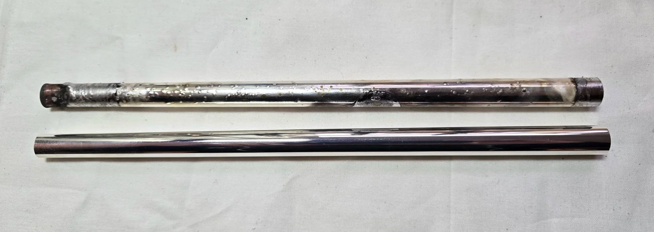 In the photo below you can really see the imperfections on the original lead pipe. Of course, below it is the new lead pipe that I will install.