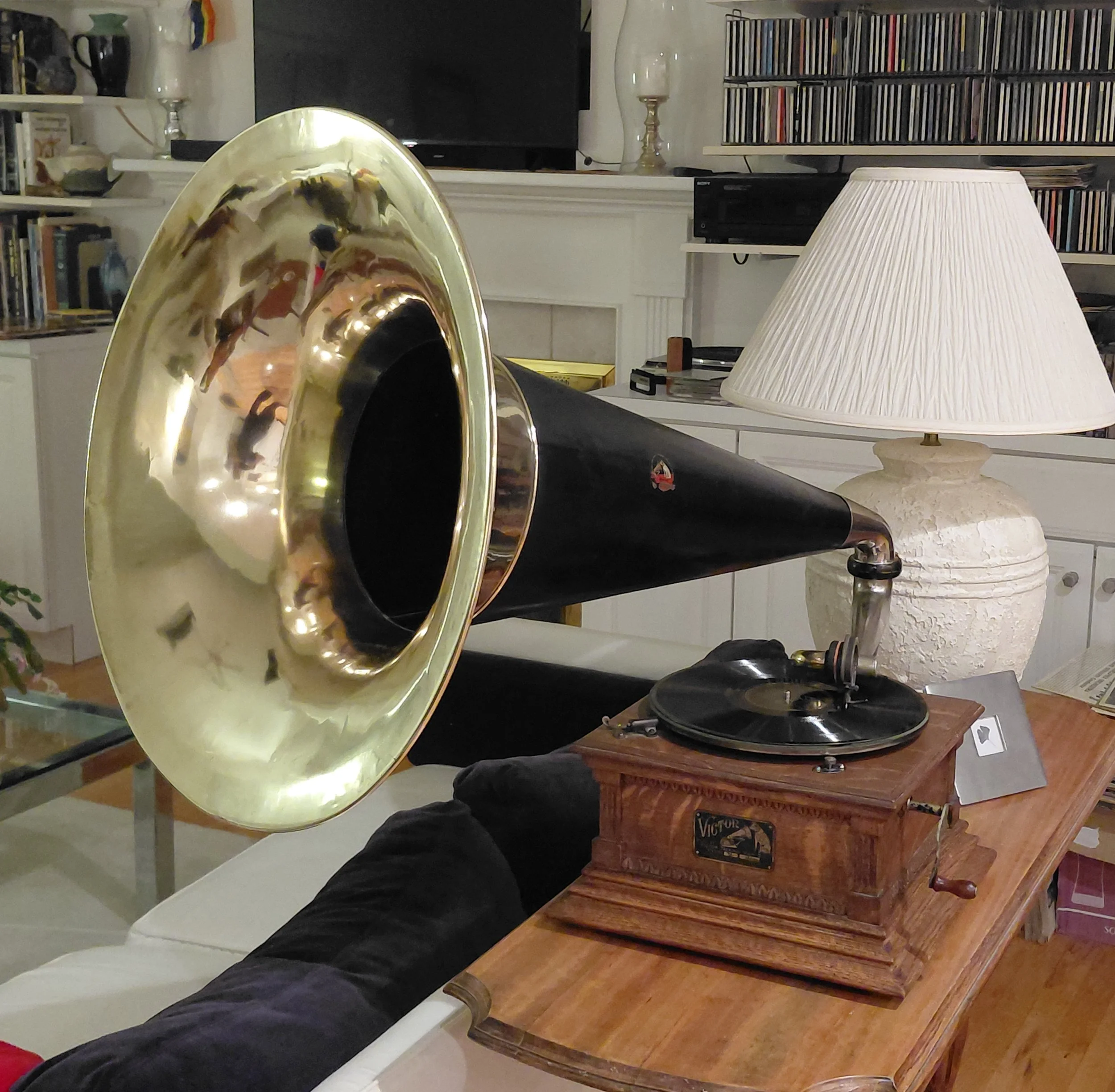 And here, in the fourth and final photo, the customer has buffed or polished the bell and re-installed it onto the Victrola box. I think that it looks amazingly good.